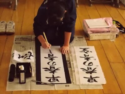 書き初めの様子が、正月っぽく紹介されています。ごらんになってみてください!