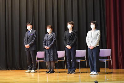 本年度、栗源中学校に着任された5名の先生の着任式が行われました。生徒を代表して斎田愛琉さんの歓迎の言葉の後に、転入された先生方の話がありました。初めて対面する先生方の話を緊張しながらも、真剣に聞く様子が見られました。