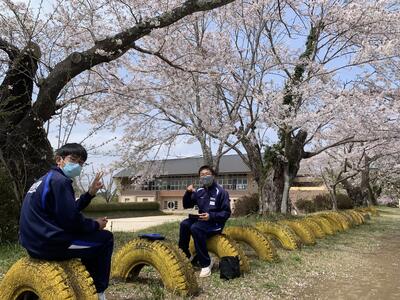 毎年恒例の、始業式の日のお花見昼食。今年も、黙食で行いました。本校に初めて来た先生方も一緒に、桜の木のもと、和気あいあい(とはいきませんが)と昼食を過ごしました。このあと、入学式の準備を行います。少ない人数ですが、みんなで協力してがんばります!