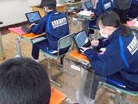 一人一台タブレットを活用し、授業が進められていました。1年生でもタブレットへの入力は慣れていて、手書きでの入力、キーボードでの入力など自分のやりやすい方法ですいすい行っています。また、グループでの話し合いも活発に行われ、和やかな中にも真剣に考える場面も見られる授業でした。