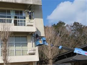音楽室の空調工事で校舎外の配管工事が行われています。取り付けるための足場がないため、高所作業車を使っての工事でした。3月中旬頃には使えるようになるといいですね!
