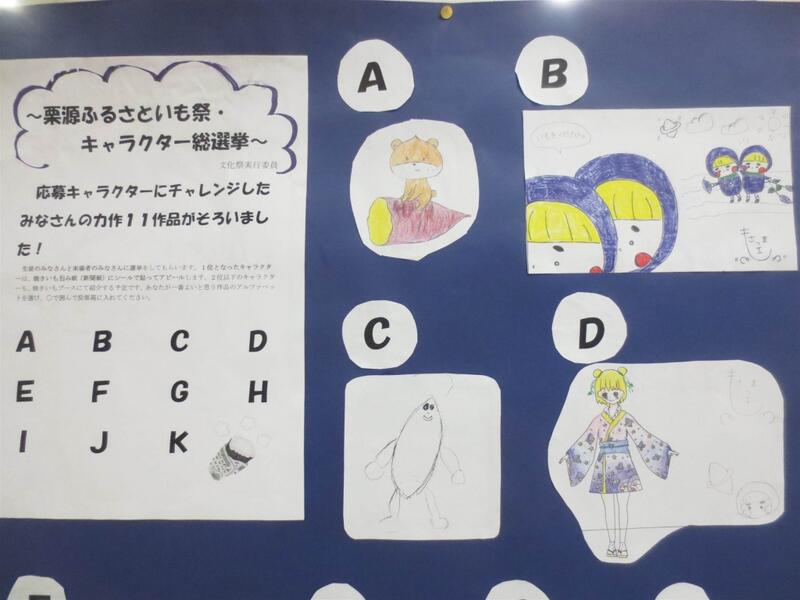 11月18日のいも祭で今年も栗源中は「やきいも店」を出店します。その焼きいもを包む紙袋に貼られるキャラクターを全校生徒に募集しました。集まったキャラクターたちは11作品。文化祭では生徒をはじめ,ご来場いただいた保護者・地域の方からキャラクター総選挙を行いました。結果発表は後日全校集会で行い,選ばれたキャラクターは,いも祭で紹介されます。