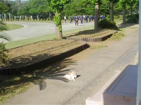 野良猫の「まさる」が朝のすがすがしい陽ざしを浴びて、校舎前のアスファルトでまどろんでいます。生徒も清々しい気候の中で、朝練習に一生懸命とりくみ汗を流しています。