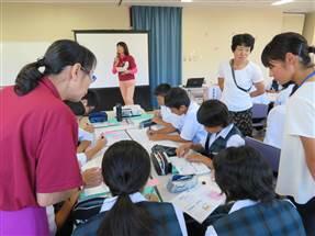 がんは一生の中で、2人に1人の割合で罹る病気ですが、早期発見・早期治療により9割の人が治ることも学習し、家族や友人の支えが大切であることを学びました。また、家族から定期検診の受診の働きかけにより、受診率をアップさせることも大事だと学びました。そして、生徒が最後に大切な人に当てて、メッセージ・カードを記入しました。誰に当てて書いたのでしょうか?