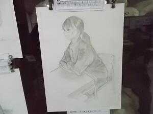 美術室の後ろの壁面には今までの作品が掲示してありました。1年生の鉛筆画は、ポーズや表情でその人の雰囲気が伝わってきて、とても素敵な作品でした。誰を描いたかわかりますか?