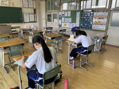 3年生の教室では、午前中部活動に励んだ2名の生徒が自習を行っていました。夏休み初日から、数名の生徒が3年生の教室で学習を行っています。家で頑張っている人もいるでしょう。1人では集中できない、という人は学校でもできますよ。涼しい教室で、時々先生方も回ってくださるので、わからない所も聞けます。良いことばかりの学校での自習はどうですか?