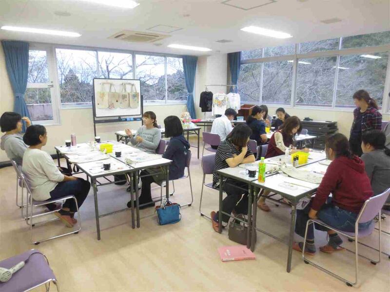 講師には,「アトリエくさか」主宰の日下ひで子先生をお迎えして,市販の安価な手提げバッグにすてきな花々を描いて,オリジナルバッグを制作しました。