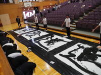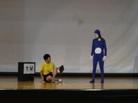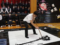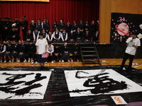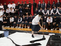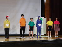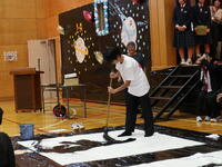 ブラスバンド部の軽快な演奏で始まり、英語スピーチ・アカペラ、保健委員会の発表と続き、豪快な書道パフォーマンス、新制服のお披露目等盛りだくさんの内容で午前の発表を終えました。