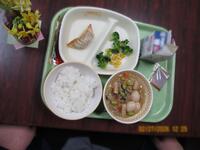 【メニュー】・ごはん ・牛乳 ・餃子 ・八宝菜 ・韓国のり ・ブロッコリーとコーン ・ドレッシング