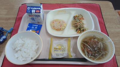 今日の献立は、ご飯、牛乳、野菜のふっくら寄せ、さわにわん、しらたきのピリからいため、レモンタルト、お魚ふりかけです。お魚ふりかけがしょっぱくてご飯に合ってておいしかったです。