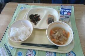 今日の献立は、牛乳、ご飯、さばのみそ煮、香取の具だくさん汁、ひじきの煮物です。