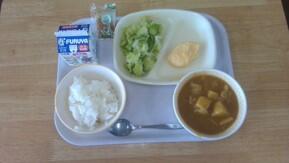 今日の献立は、牛乳、チーズオムレツ、チキンカレー、枝豆サラダ、青じそドレッシングです。チキンカレーのチキンがたくさん入っていて、うれしかったです。
