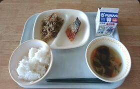 今日の献立は、牛乳、ご飯、さばごまみそだれ、みそ汁、いりどり、ミニデザートです。みそ汁の、味がこくておいしかったです。