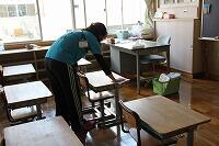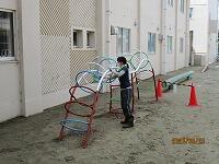 ↑教室の机一つ一つをきれいに。 ↑グラウンドや砂場の整備もしました。