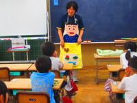 この日は、栄養教諭の先生が特別に用意してくれたお話を、エプロンを使って楽しく見せてくれました。