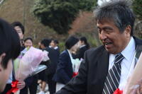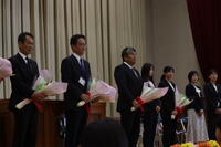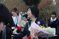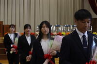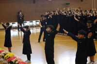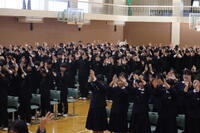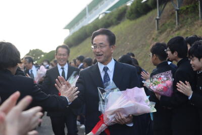 その後11名の先生方に今までの感謝の気持ちを込めた、生徒会本部役員を中心とした全校生徒での「エール」、校歌斉唱や先生方が退場される際の「さよなら友よ」の合唱が体育館中に響きわたり、素敵な離任式となりました。