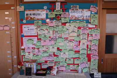〇絵馬に願いを込めた教室と廊下の掲示です。