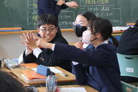 現在1年生は、ふれあいの時間を使って「福祉学習」を進めています。今日は、5・6時間目に小見川高校で福祉を学ぶ高校生が来てくれて、ていねいに教えていただきながら様々な体験をしました。