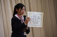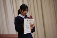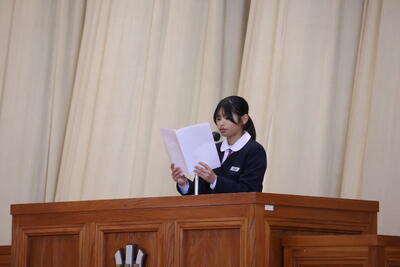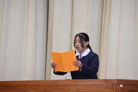 また、各学年代表生徒の発表の後には、「全国人権作文コンテスト」で千葉県最優秀賞を受賞した 多田 風花 さんが、全校生徒に受賞した作文を聞かせてくれました。多田さんの小学校の頃の苦労やその時の気持ち、そしてそれらを乗り越えて今を頑張っている感謝の気持ちが綴られた作文で、全校生徒一人一人の心に伝わったと思います。