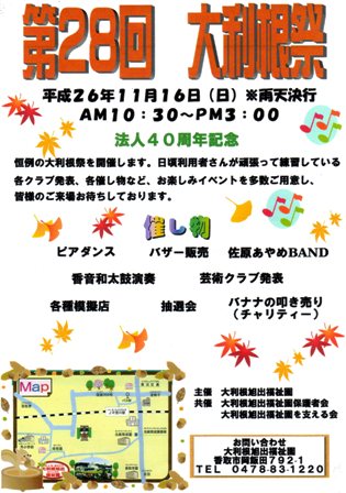 ボランティア体験学習(その5) 投稿日時 : 2014/11/16 omigawa 今日は大利根旭出福祉園で行われた「第28回大利根祭」のお手伝いです。27名のボランティアが終日頑張りました。小見川高校の先輩たちもいっしょです。天候に恵まれ,昨年以上のお客さんが来場しました。一番人気のバザーには,11:00のオープンを待てないたくさんのお客さんが列をつくっていました。