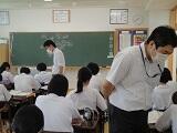 右側;3年生の朝自習の時間。夏休みの高校訪問の事前指導を行っていました。自分の目で高校を見て、雰囲気を感じてきてください。