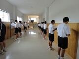 右から2枚目、右側;2年4組男子。とても力強い歌声です。1棟と2棟の間の通路でパートリーダーを中心に練習しています。