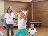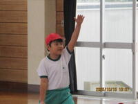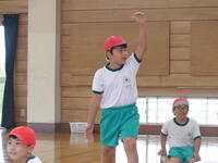 2時間目の途中から雨が降り始めたため、体育館で「スポーツタイム」を行いました。全校で体を動かすのは久しぶりです。アザラシ、いぬ、うさぎの縦割りチーム対抗戦で「ボール回しリレー」を行いました。アザラシチームは、頭の上から、股の下からと、ボールをスムーズに受け渡し、三連勝することができました。