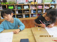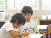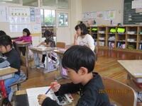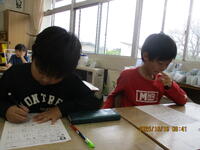 一年生は漢字練習をしていました。字のバランス、書き順、鉛筆の強さ等を意識しながら、しっかりとした字を書いていました。二年生は反対語について学習しました。「前の反対は?…後ろ」「細いの反対は?…太い」などです。「おす(押す)の反対は?…ひく(引く)」と答えてほしいところでしたが、「めす(雌)」と答えた東っ子がいました。個人的に花丸ですね。四年生は算数のテスト、五年生は公約数と公倍数について学習しました。