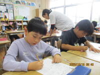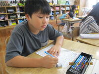 4年生は書写の授業がありました。児童は真剣に「花」という字を書いていました。現代では、お手本に動画を活用することもあり、文明の進化に驚くばかりです。