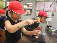 4年生は脱穀体験を行いました。用務員さんと担任の先生の指導の下、東っ子は皆、江戸~昭和中期にタイムスリップしました。2種類の千歯扱き(せんばこき)と唐箕(とうみ)を使いました。昔の方の知恵を知り、苦労を知り、お米一粒の有難みを知る貴重な体験でした。