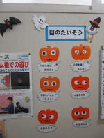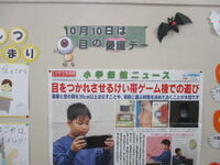10月の保健目標は「目を大切にしよう」です。視力を維持するためには、「姿勢」「照明の明るさ」「目の休憩」が大事です。勉強、読書、ゲーム等の際には、十分気をつけましょう。