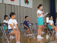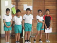 本日は前期終業式が行われました。受賞報告の後、1年生と4年生の代表児童が半年間の頑張りについて述べました。とても立派な発表でした。校長先生からは、「三連休は通知表を参考にしながら前期をよく振り返り、後期に生かしてください」という話をしました。42名の東っ子の皆さん、気持ち新たに後期をスタートさせていきましょう。