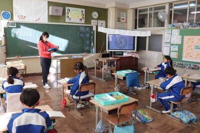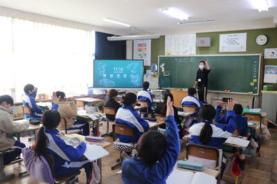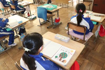 算数の授業では、「時計の見方」を学習しました。アナログの時計を使って、担任の先生が示した時間が「何時何分か」を考えました。学校内は、教室や体育館等全てがアナログの時計になっています。この学習を通して時間をよんで行動することにつなげられるといいですね。