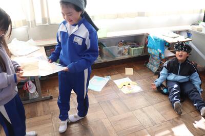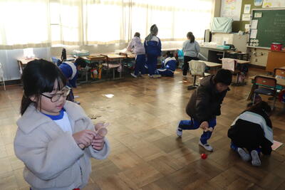 生活科の授業では、「昔の遊び」について学習しました。先日の地域交流会で教わった「けん玉」や「メンコ」、「福笑い」等を行いました。児童が一番に盛り上がったのは、「福笑い」でした。