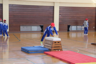 体育の授業では、「跳び箱運動」を行いました。自分で段の高さや向きを選んで跳んでいました。担任の先生から「助走⇒両足踏切⇒両手を上からなるべく遠くに着く⇒着いた手で体を前に⇒着地」の話がありました。どの児童も前向きにすすんで取り組んでいるので、どんどん跳べるようになっていました。