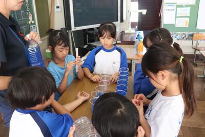 水遊びをしました。担任の先生が用意したプール2つにそれぞれ手作りの船を浮かべたり、魚釣りをしたりしました。大きなプールでは、数人で水にもぐる姿が見られました。天候にも恵まれ、木陰の場所で楽しい体験学習をしました。次回は他学年と交流する予定です。