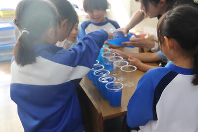 音楽の授業では、導入部分でリズム体操をしていました。手拍子や体をつかってのリズムなど楽しそうに活動していました。理科の授業では、グラウンドに太陽の動きを影で示す、手作り日時計を使って休み時間のたびに印をつけていました。