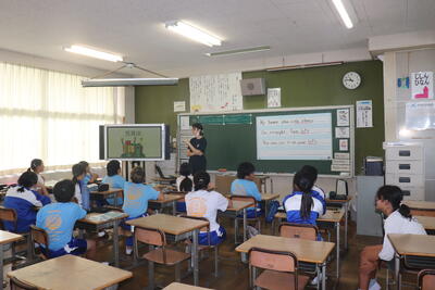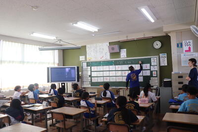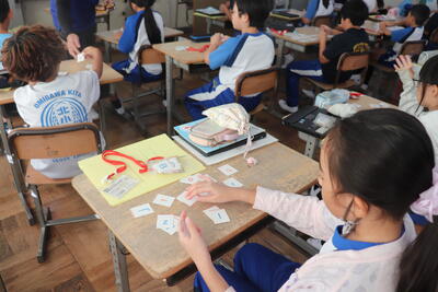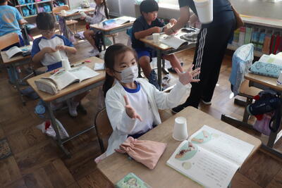 英語の授業では、センダン教室でグループ毎に分かれて英語の質問の答えのカードをかるた取りのように行っていました。手を頭の上に乗せてから「What would you like ?」と言い、ALTの先生が言う英語の単語カードを取り合っていました。楽しみながら授業に取り組んでいました。