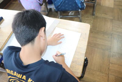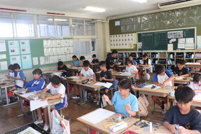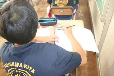 暑中お見舞いのはがきを作成しました。前時に下書き用のプリントに記入しておいた文面や宛名を文字の位置や大きさに気を付けながら本物のはがきに書き込んでいました。送り先は北小学校の先生方宛てでした。夏休みに届くのが楽しみです。