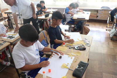 算数の授業では、今回学習した「三角形」や「長方形」等の形に切った色紙を使って模様を作りました。それぞれの児童が選んだ色と形の折り紙を上手に組み合わせながらきれいな幾何学(きかがく)的な模様の作品を仕上げていました。