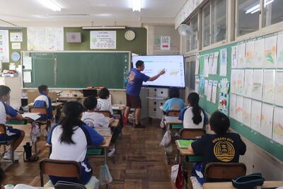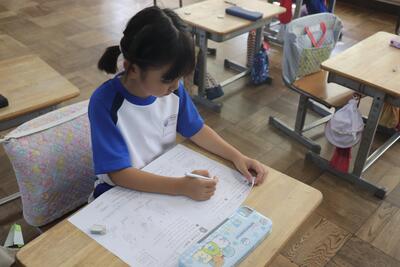算数の授業では、身近な物からかけ算を使って表すことに取り組んでいました。例えば、ロッカーが縦2個、横20個だったら2×20で40個という式や答えをプリントにまとめていました。かけ算を実際の生活で使う場面は多いです。ぜひ、参考にしてほしいと思います。