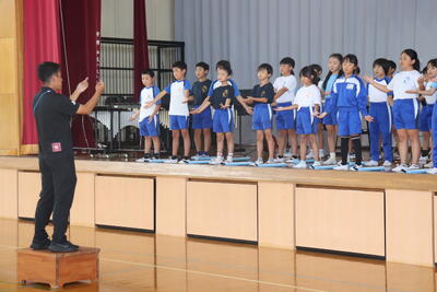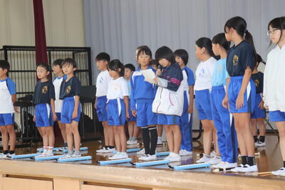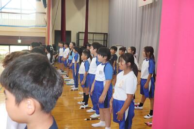 44日間に及ぶ夏休みも昨日で終わり、学校生活の再スタートにあたり、夏休み前に引き続き全校児童出席のもと、全校集会が行われました。校歌合唱の後、書写展の表彰があり、4名の児童が表彰されました。次に校長先生から「あいうえお」の頭文字を使って、9月から頑張って欲しいことについてお話がありました。その内容は、「あ 夏休み前のように元気なあいさつ」、「い 今週予定されている上学年の稲刈り(芋ほりも)」、「う スローガンを掲げて6年生を中心に運動会へ」、「え 全校児童、保護者、地域の方と演劇鑑賞会」、「お 練習を重ねてきた音楽発表会」です。この他にも各クラスでの校外学習や陸上競技大会等、たくさんの学校行事が予定されています。児童の皆さんは、目標を立てて、行事や学習に取り組んで欲しいと思います。また、生徒指導担当の先生からは、悩みや困ったことがあれば、すぐにお家の人や先生に相談することについてお話がありました。まだまだ暑い日が続きますが、元気に頑張っていきましょう!!