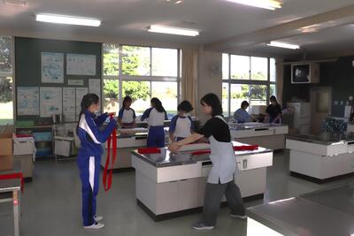 家庭科の授業では、ミシンを使ってエプロンを作っていました。あらかじめ自分で選んだデザインの布地に折り目をつけてから、順番にミシンで縫っていました。途中、児童が苦戦していると保健室の先生が手伝いに来てくださり、おかげで作業が進みました。