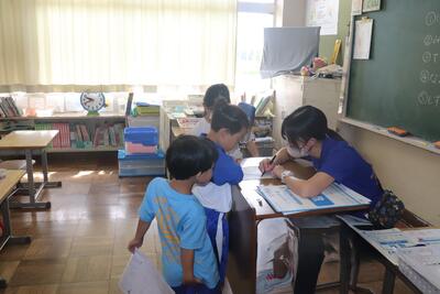 前回、学校生活をよくするために各委員会ごとに新たな取組を紹介しましたが、今回は、学校のみんなのために地道に毎日活動している姿を紹介します。環境安全委員は、児童の玄関である昇降口の清掃をしてくれます。放送委員は、朝の放送で、予定の連絡や音楽をかけてくれます。保健委員は、熱中症指数の連絡と出欠黒板の記入、牛乳パックの処理をしてくれています。あたりまえのように、毎日みんなのために行ってくれているこれらの活動で、気持ちよく一日がスタートできます。ありがとうございます。
