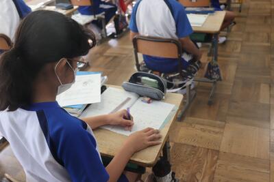 算数の授業では、「比例」について学習しました。表からXとYがそれぞれ比例の関係になることや、増加だけでなく、減少における比例についても確認してから、練習問題に取り組んでいました。