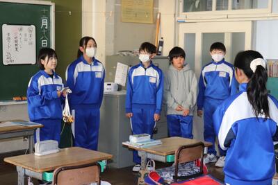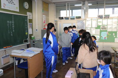 外国語の授業では、「英語で交流しよう」ということで、隣の小学校と英語で対話をしました。以前、オーストラリアの児童と行ったことがあるので、対話はスムーズにすすみました。終わったら、振り返りとしてタブレットに感想を打ち込みました。外国語(英語)の授業での交流でしたが、4月からは小見川中学校で一緒に生活する仲間なので、よい機会となりました。