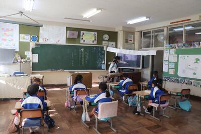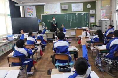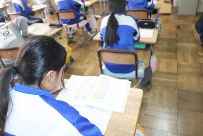 算数の授業では、「比例と反比例」の復習問題に取り組みました。先生から配られたプリントをじっくりと解いていました。その後、友達同士で分からない問題を一緒に考えたり、教え合ったりして確認をしていました。