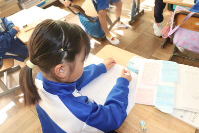 国語の授業では、「いきもののひみつを知らせよう」という内容について学習しました。特に文章の組み立てである「はじめ」と「なか」の流れや「段落が変わるときのきまり」などについて学びました。その後、児童各自で「いきもの(飼っている動物や昆虫など)」の作文をメモをもとに書きました。