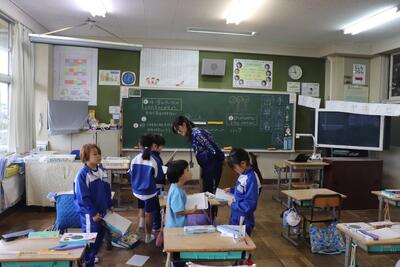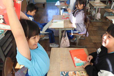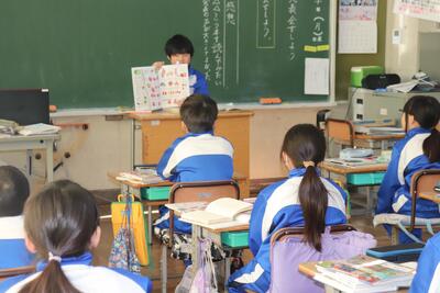 国語の授業では、「本を紹介しよう」という内容の発表会が始まりました。前回までに各自で決めたテーマに沿って本を集め、それをもとに書いた読み原稿で発表しました。クラス全員の前での発表は緊張している様子も見られましたが、「野菜(トマトなど)」や「学校」などテーマごとに本を紹介しました。わかりやすくて本について興味を抱かせる発表でした。