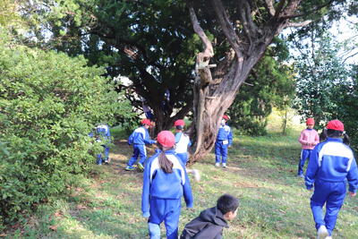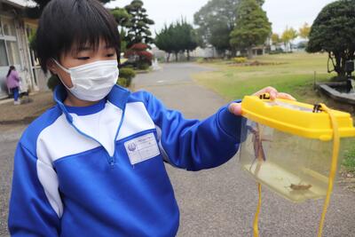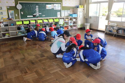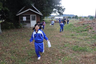 国語の授業では、「おもしろいものみつけたよ」という内容で、自分の好きなものや興味のあるものをさがしました。校庭に移動して、枯葉やどんぐり、バッタやカエル、石など、児童が選んだものを採取していました。この後、教室に持って帰ってお互いに見合ったり、発表したりするそうです。